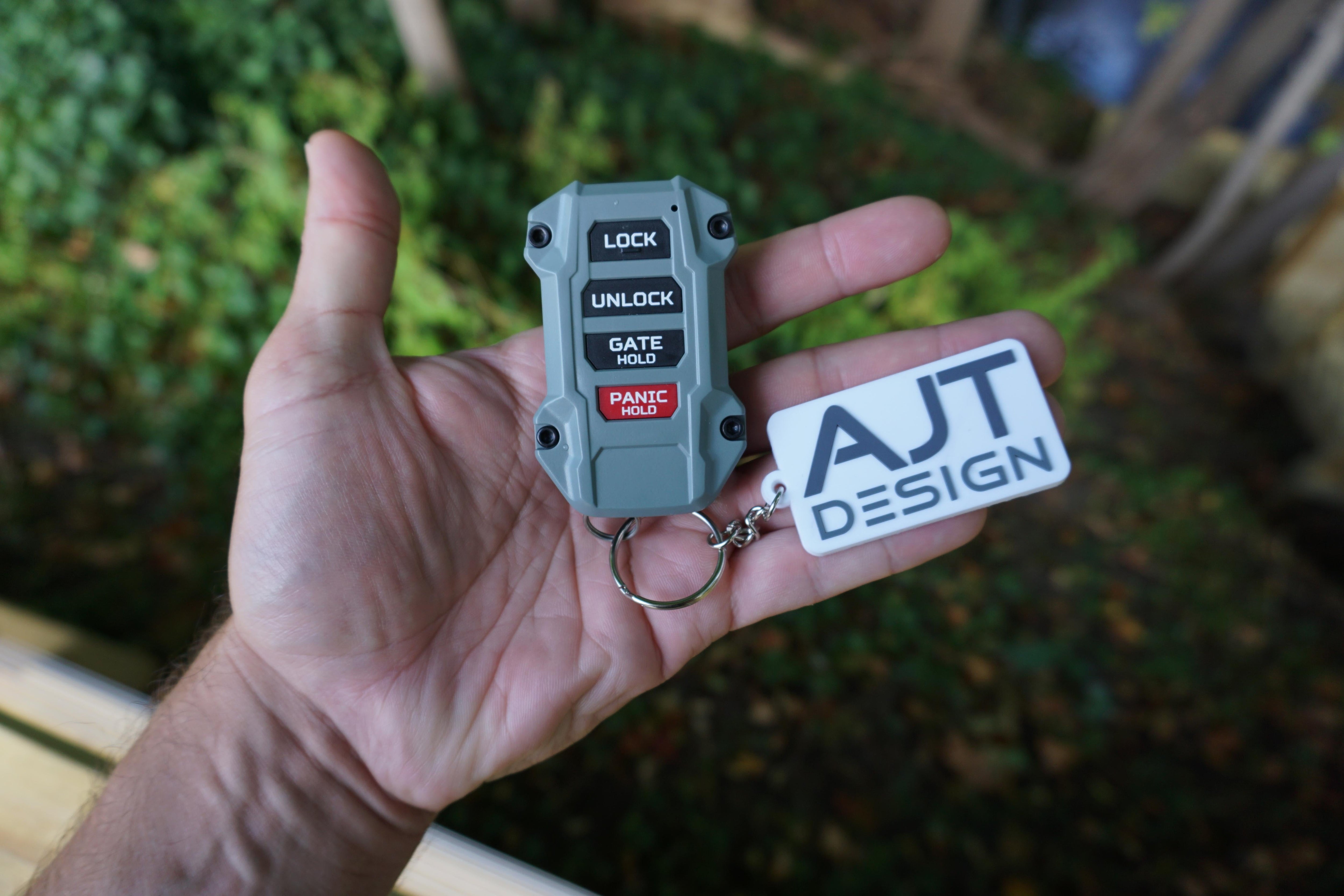 Rubber keychain with the AJT DESIGN logo.