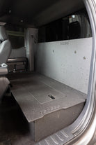 For the design, we utilized our preferred design of 60/40 split. This design allows the user to add a fridge or cooler behind the passenger's seat in a front to back orientation. Keeping the 60% space wide open and usable. Fridge models that would easily fit in this space include: