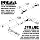• Upper- Double adjustable design, for easy fine tuning after install. No need to uninstall anything to adjust the length. Simply loosen the jam nuts, dial in your lengths, and then tighten the jam nuts back down. Double-adjustable arms also have twice the adjustability length (3in) versus single-adjustable arms.