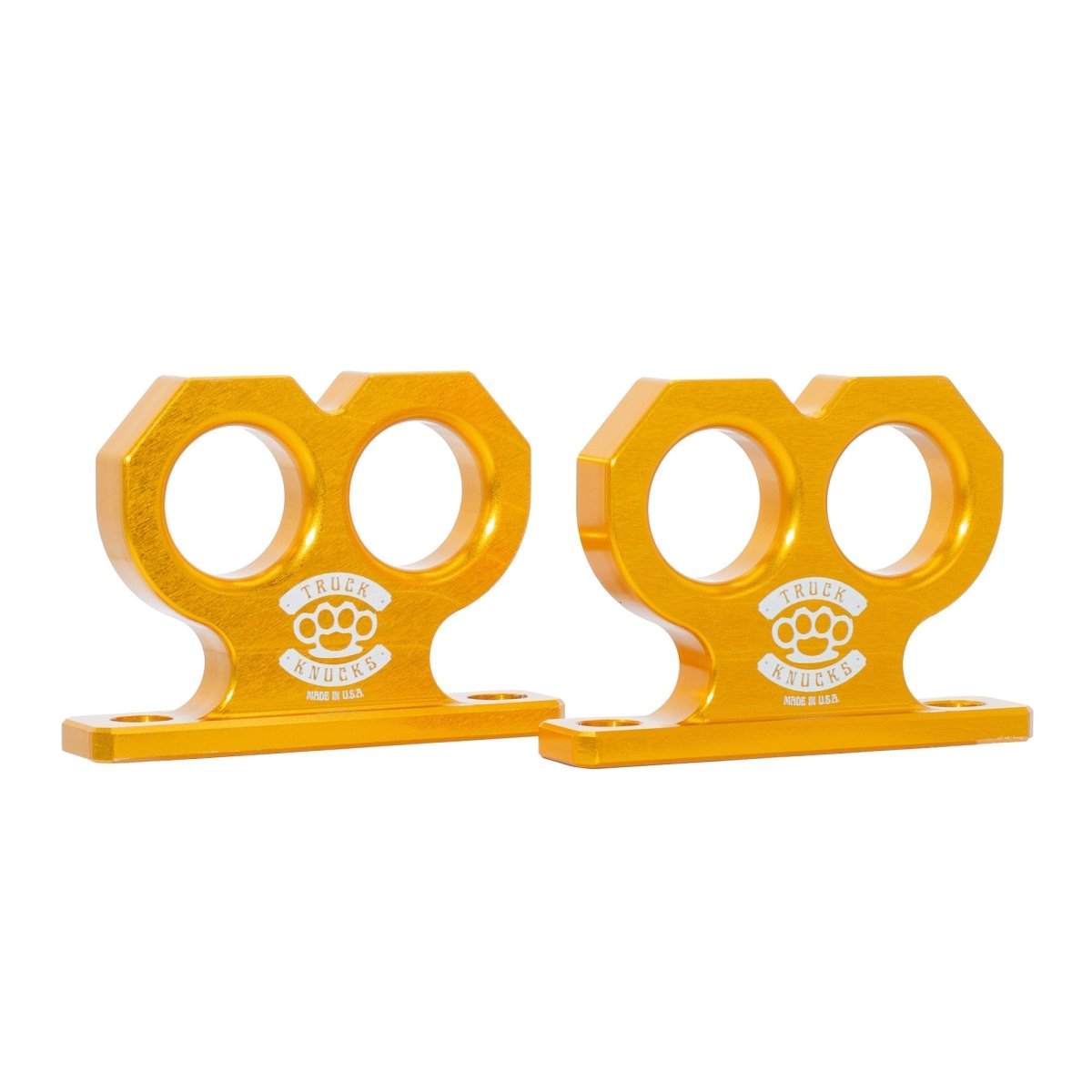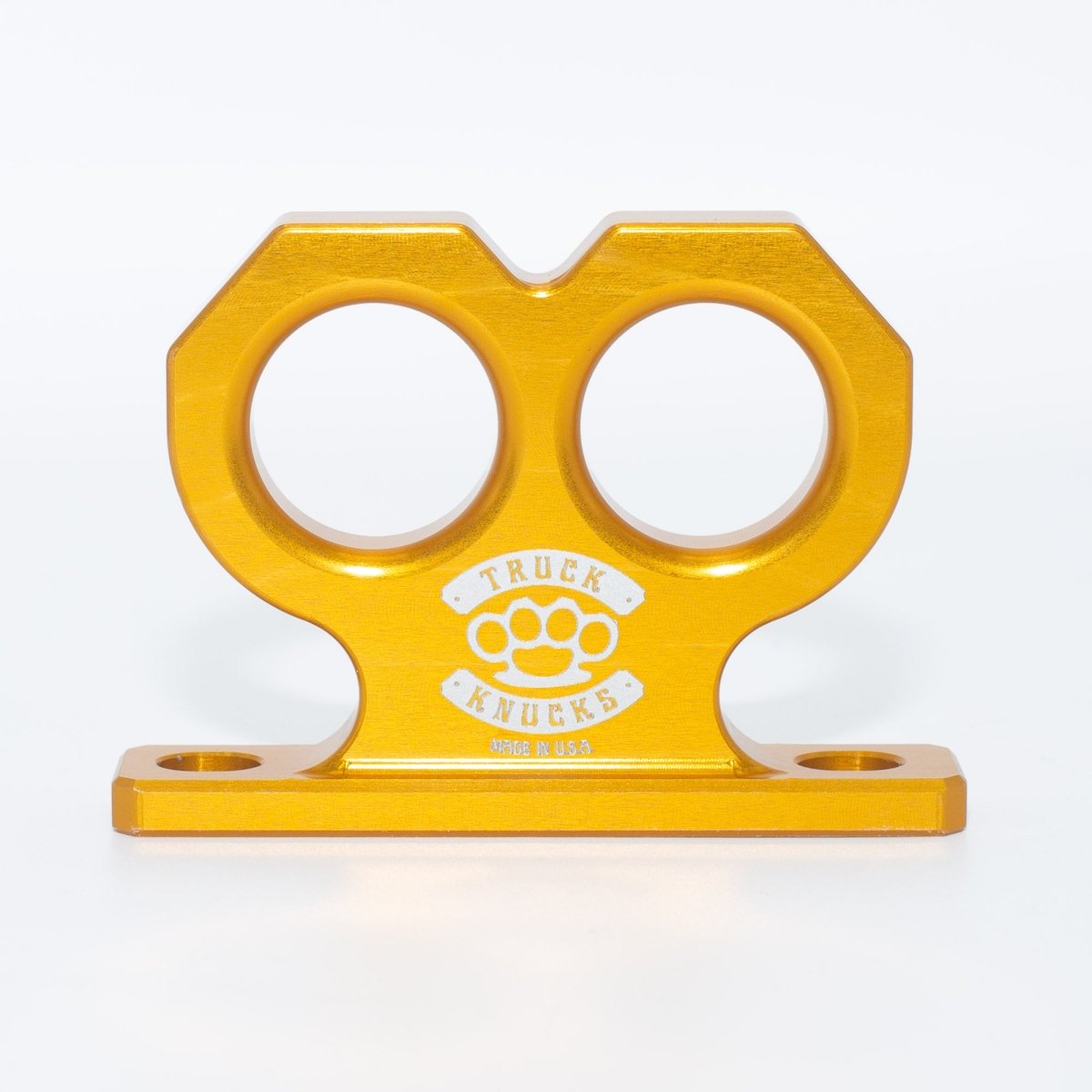 Make a statement with the Gold Two Knuck, where craftsmanship meets attitude. Precision CNC-machined from anodized billet aluminum, this two-finger brass knuckle–inspired tie-down point replaces OEM bolt on tie-downs on the truck bed wall for Toyota Tacoma and Tundra. Its gold anodized finish not only turns heads but also delivers superior protection from corrosion and wear. With two tie-down points built into its sleek design, the Gold Two Knuck is built to perform—and made to stand out.