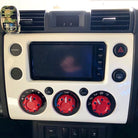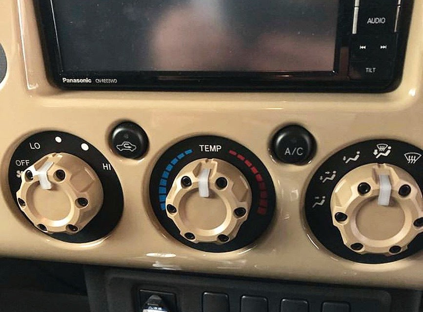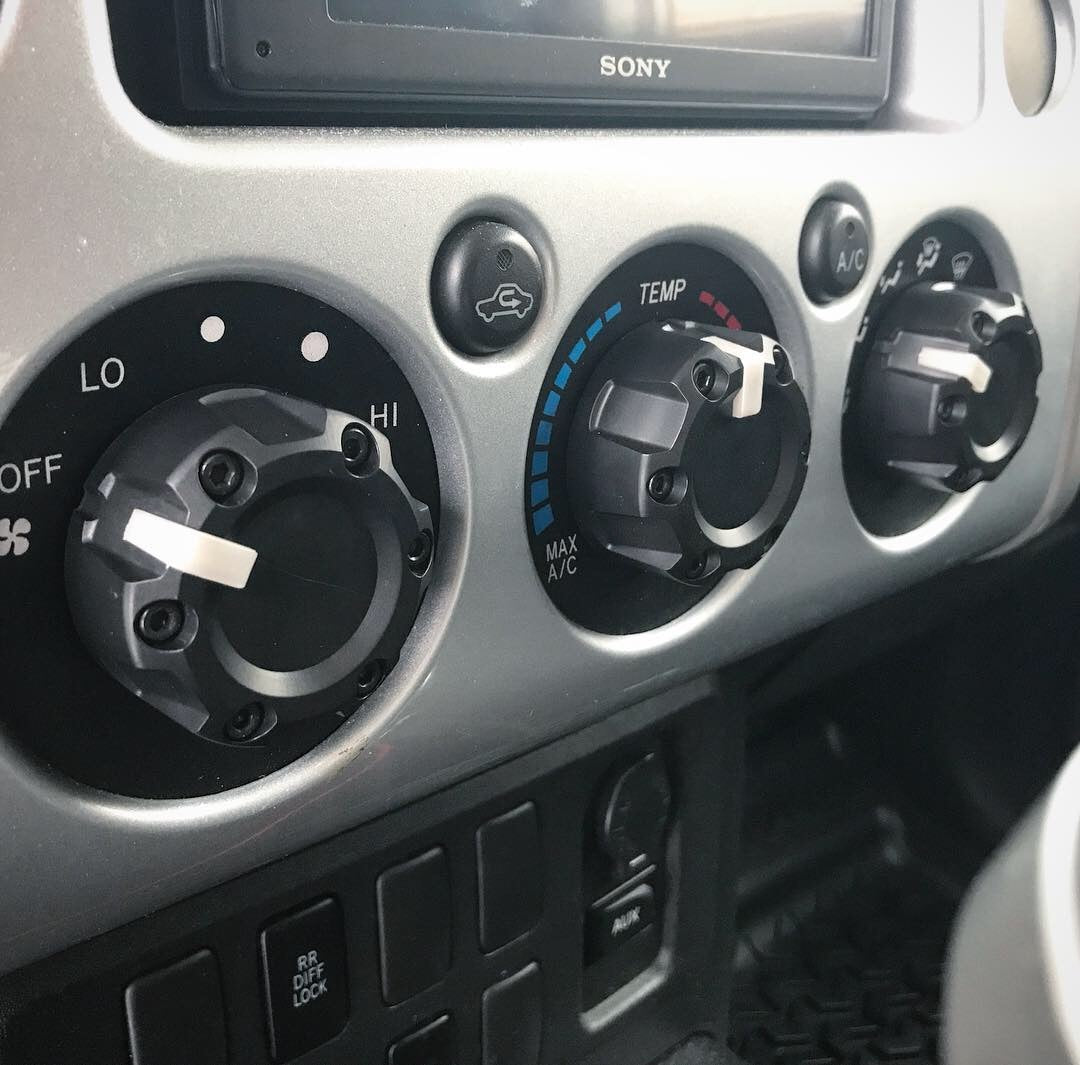 Replacement dial style climate control knobs for the 2007+ FJ Cruiser. Injection molded of high strength and impact resistant ABS plastic. Socket head cap screws for rugged good looks. Clear indicator lights up the same color as OEM and provides tactile feedback. Assembly requires the metal clips to be removed from the OEM knobs and placed into the AJT knobs for a snug OEM like fit, pull off/press on. Assembly requires a small screwdriver or needle nose pliers, dental pick, etc (not included) to remove clip and 7/64" allen key (included) to install screws. Made in USA.